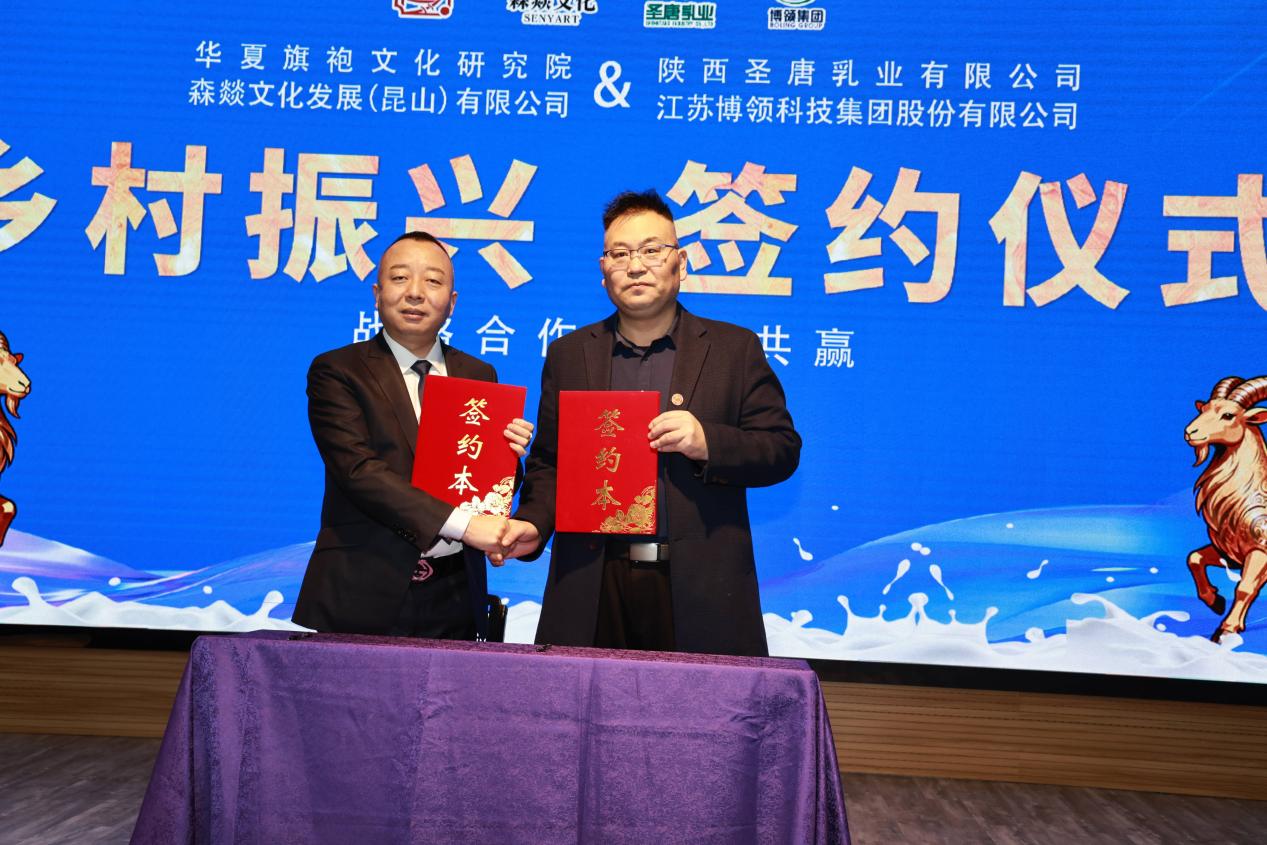 还有来自全国各地的旗袍分院代表、企业家代表、爱心公益代表、乡村振兴助农代表共180余人参加会议。会议围绕华夏旗袍文化传承、非遗文创产品推广、乡村振兴助农、公益慈善捐赠、百年旗袍演变舞台剧巡演、千里江山图旗袍长卷旅拍、华夏旗袍文化博物馆落地、华夏之源俱乐部方案实施、美国纳斯达克敲钟上市、香港并购上市等一系列精彩内容进行分享。顾金昌、何文、廖明金、郭峻旗、周一凯等分别就其中相关板块进行阐述。富平县梁勇副县长、富平县市场监督局刘军安副书记、富平县畜牧发展中心李芳娥书记分别就“新质羊乳振兴乡村 华夏旗袍闪耀东方”相关内容发言。同时见证华夏旗袍、森燚文化与圣唐乳业、博领集团“乡村振兴”签约仪式。